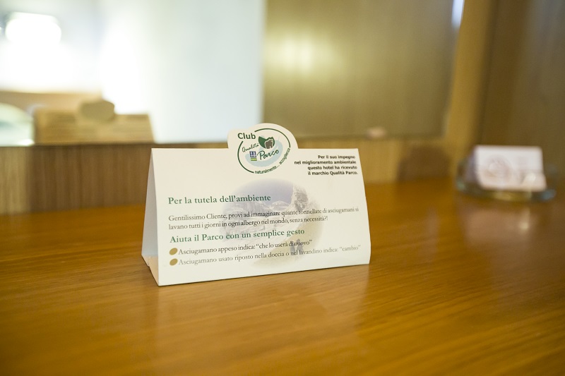 Qualità Parco“ zur Förderung des nachhaltigen Tourismus wurden die Bäder unserer Zimmer mit Durchlauf- und Durchflussbegrenzern ausgestattet: Dies erlaubt uns, Wasser zu sparen, eine wertvolle Ressource, die für alle Lebewesen unentbehrlich ist. Für den täglichen Reinigungsdienst benutzt unser Personal umweltfreundliche Reinigungsmittel. Bett- und Handwäsche wird nur auf Anfrage der Gäste gewechselt.